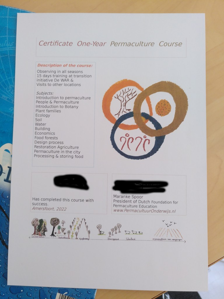 I managed to get my Permaculture Design Certificate, I can’t say I enjoyed the process. the classes stressed me out and got me very overstimulated, too much words, too little info in my opinion. and too much talking in general. I recently got diagnosed with autism, so that makes sense. I don’t want to discredit the teacher, but it was definetely not my kind of learning and am very relieved this is over.